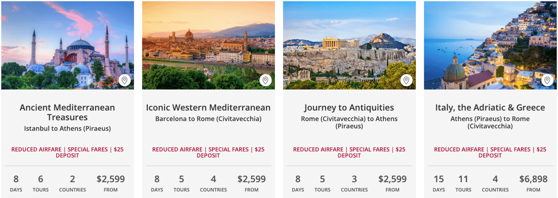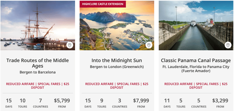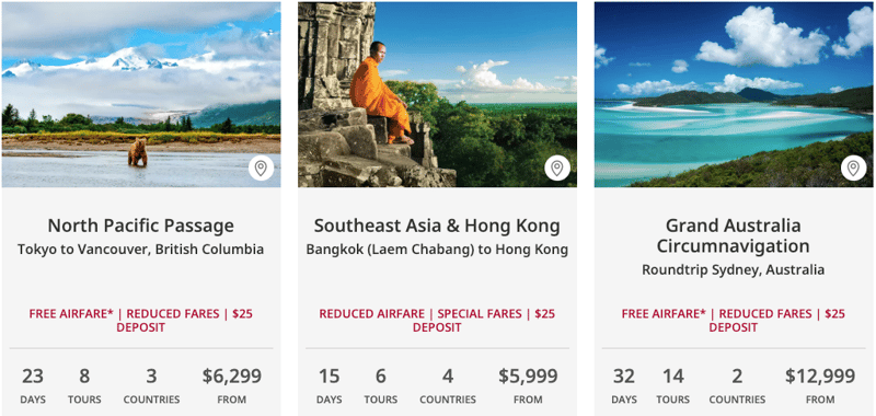 Special fares plus FREE airfare valid on select departures of Grand Australia Circumnavigation, North Pacific Passage, Panama Canal & Central America, Panama Canal & the Pacific Coast.