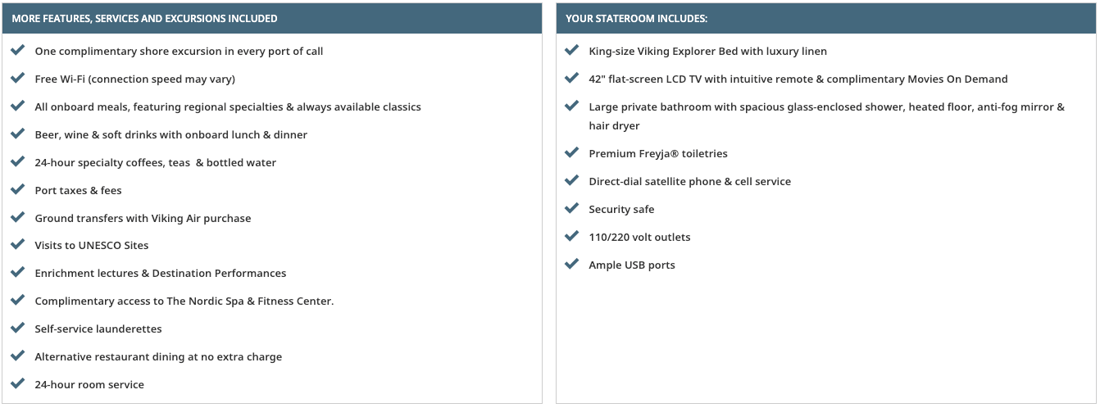 GENERAL RESTRICTIONS: Cruise fares listed are cruise only in U.S. dollars, per person, based on double occupancy. Single supplement savings are off applicable rates. Cruise fares listed are valid for U.S. residents only. All fares and offers are for new bookings only and are subject to availability, may not combinable with other offers except Viking Explorer Society Travel Credits, are capacity-controlled and may be withdrawn at any time without prior notice. Special fares are based upon published full brochure fares; cruise fares do not include pre-paid charges, optional facilities, and personal charges, as defined in the terms and conditions of the Passenger Ticket Contract which may be viewed elsewhere on this website. Full brochure fares may not have resulted in actual sales in all stateroom categories and may not have been in effect during the last 90 days. Promotional fares may remain in effect after the expiration date. Air promotion applies to roundtrip flights only from select Viking Cruises U.S. gateways and includes airport-to-ship or hotel transfers, air taxes and air fuel surcharges. Roundtrip airport transfers are included when air is purchased with a cruise or cruisetour package; if air is not purchased from Viking, transfers may be purchased separately. All transfers must be in conjunction with a Viking-purchased cruise, cruisetour, land extension or extra hotel nights. Viking reserves the right to correct errors or omissions and to change any and all fares at any time. For up-to-date prices, please call Viking or your Travel Agent. Additional terms and conditions may apply. Complete terms and conditions may be found in the Passenger Ticket Contract.