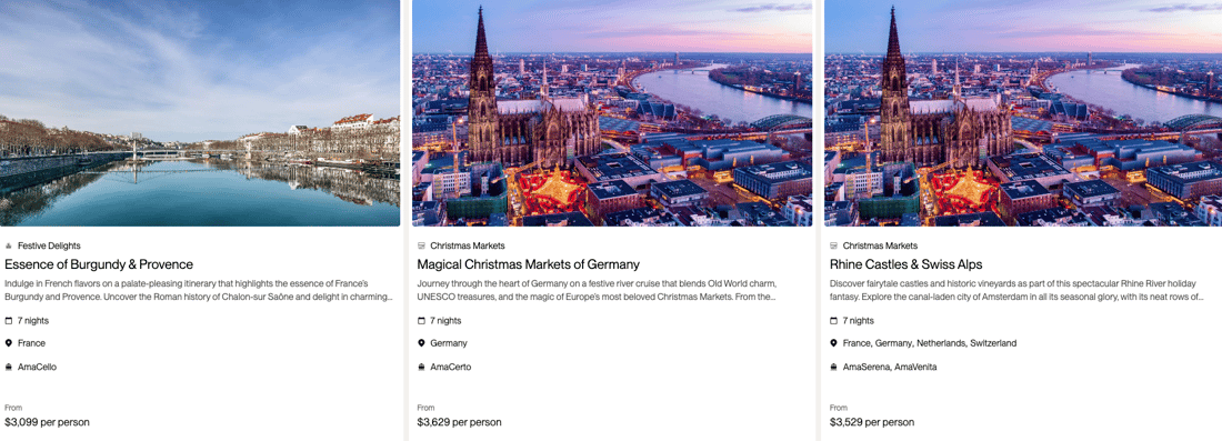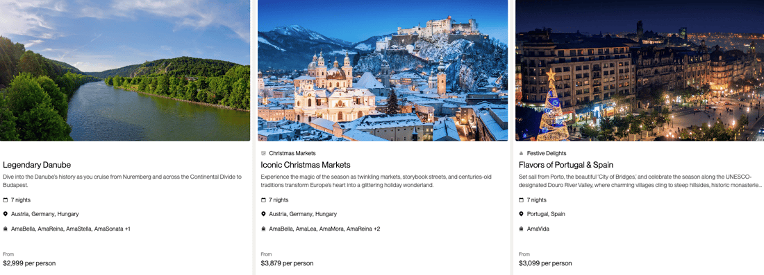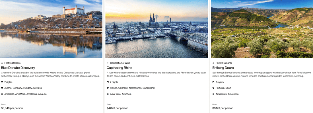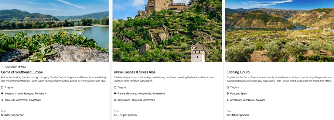 Terms & Conditions: All rates are per person in USD for cruise only, based on double occupancy in Category E stateroom, inclusive of port charges. Offer includes one complimentary eligible Land Package per person on new FIT and Group reservations made December 31 - March 31, 2026, for select 2026 and 2027 Europe and Colombia sailings. Offer valid on double occupancy; Tour Operators eligible; additional restrictions apply. Availability of sailings and land packages may vary due to local events. Not all advertised Land Packages are eligible; details provided at booking. Additional land packages available for purchase. Complimentary Land is valid only with a full-fare cruise; hotel-to/from-ship transfer included; airport transfers available at extra cost. Offer combinable with AirPlus Rates, Combination Cruise Savings, Past Guest Savings, and Future Cruise Benefit Program. Solo travelers must pay full single supplement to receive complimentary land. Offer not applicable to travel advisors, industry rates, or other restricted offers. Hotel listings are not guaranteed and may be substituted with similar properties; AmaWaterways will confirm hotel details 3–4 weeks prior to departure when Digital Travel Documents are issued. Stateroom upgrades, optional land packages, visas, airfares, and gratuities are additional. Offer is capacity controlled, combinability limited, and subject to change or withdrawal without notice. AmaWaterways reserves the right to correct errors or omissions. Registration as a seller of travel does not constitute approval by the State of California. For full terms and conditions, visit www.amawaterways.com/terms-conditions. CST#2065452-20.