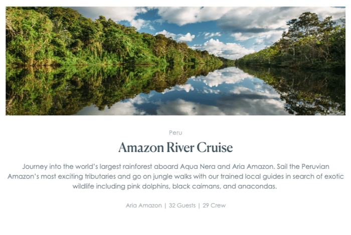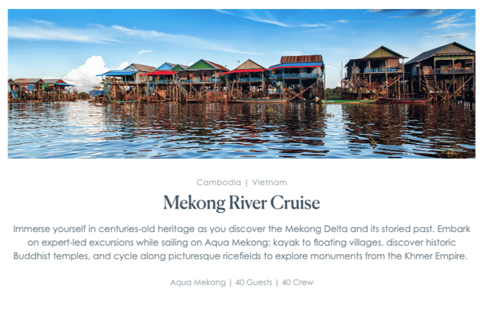 A recognized travel company and leader in luxury, small ship cruising since 2007, Aqua Expeditions explores the world’s most legendary waterways, the Amazon River in Peru and the Mekong River in Vietnam and Cambodia. Our luxury cruise lines, the Aria Amazon on Peru’s Amazon River and the Aqua Mekong sailing the Mekong River, feature a 1:1 crew-to-guest ratio, outstanding levels of customer service, complimentary wines/beers, unique cultural excursions, active adventures by kayak and bicycle, experienced naturalist tour guides, wildlife, discovery, entertainment and fun.