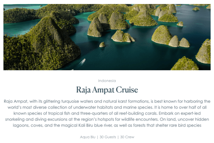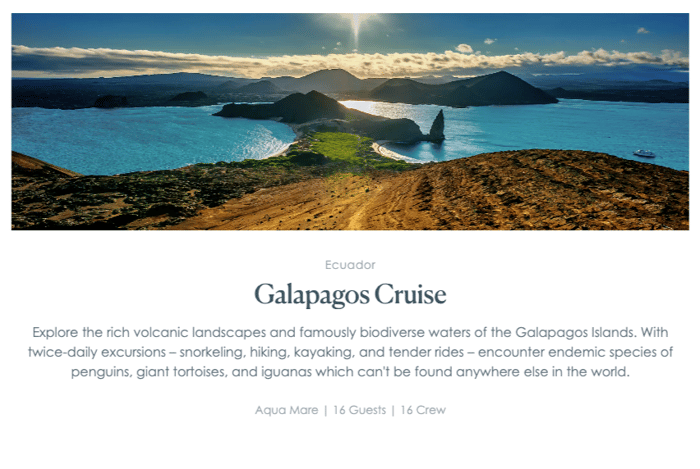 Since the very beginning, Aqua Expeditions has pioneered the launch of unique small ship expeditions designed to explore remote destinations around the world. Today, their fleet of five showcases the perfect blend of adventure and luxury, setting a new standard for expedition cruising in the waters they sail. From the Amazon River of Peru and the Mekong River in Southeast Asia to the Galapagos Islands of Ecuador and the pristine coastal waters of Eastern Indonesia, the signature Aqua Experience remains at the core of each of their expeditions.