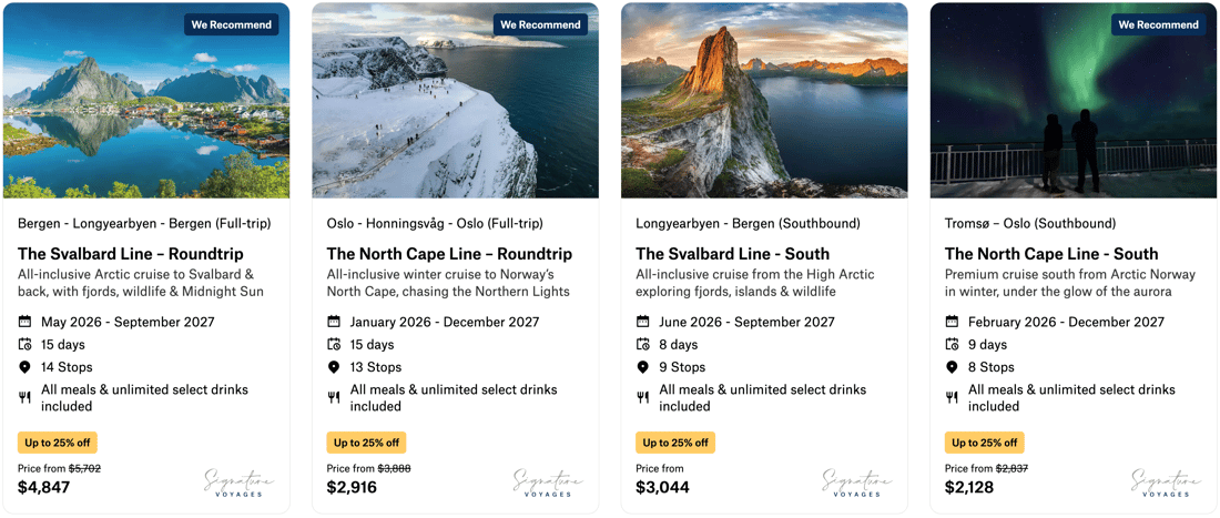 Sail along Norway’s coast beneath the glow of the Midnight Sun on our premium Svalbard Line and save up to 25% on select departures.