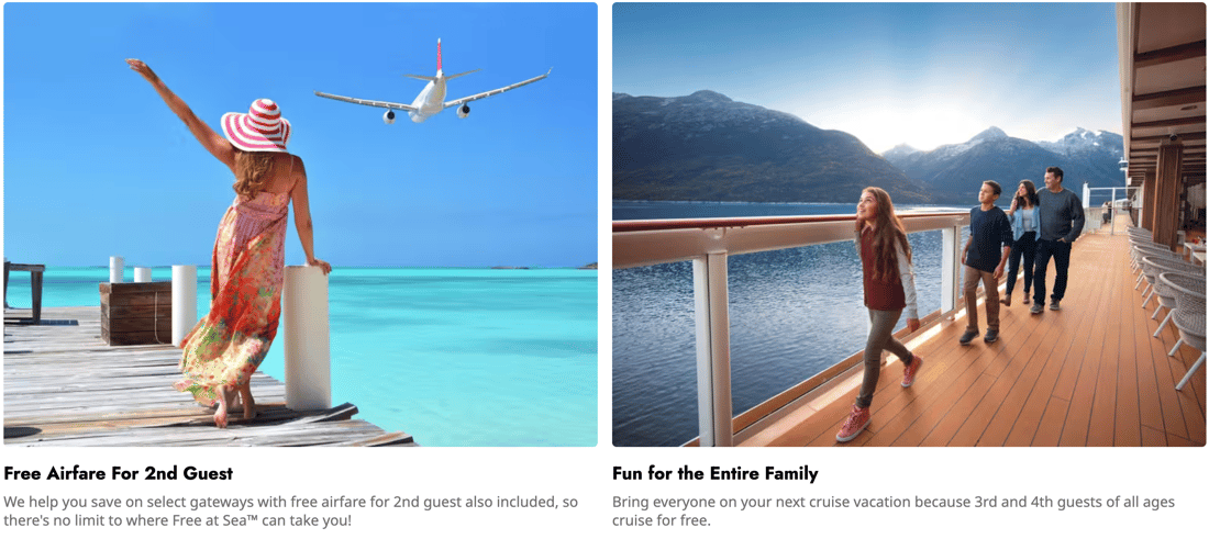 - Free at Sea™ choice(s) must be selected at least 24 hours prior to sailing and cannot be changed on board. Bookings made within 24 hours to departure can choose promotion at time of booking.