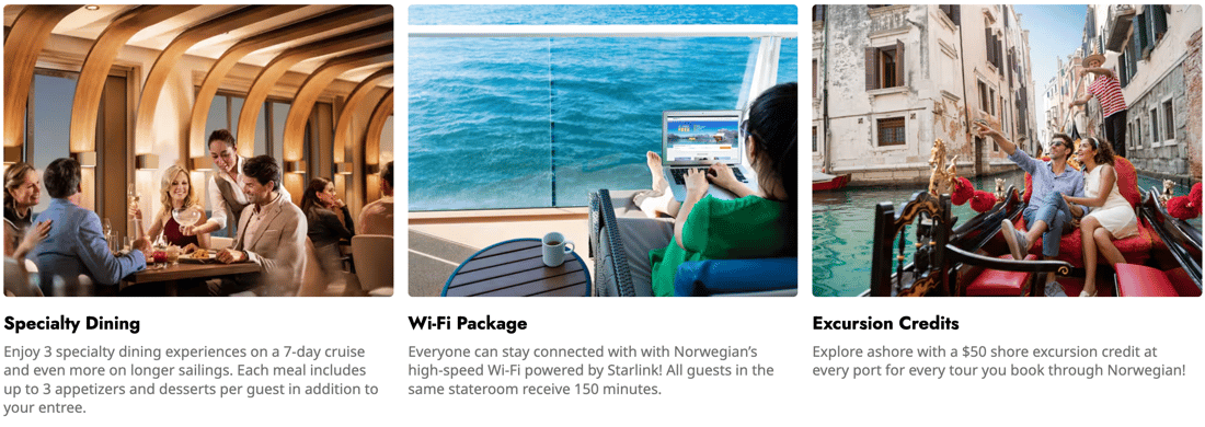 NORWEGIAN CRUISE LINE: Virtuoso guests will enjoy up to $200 Shipboard Credit per stateroom for Oceanview staterooms or above on select voyages. The onboard credit amount is dependent upon Itinerary, length of cruise, and category booked: