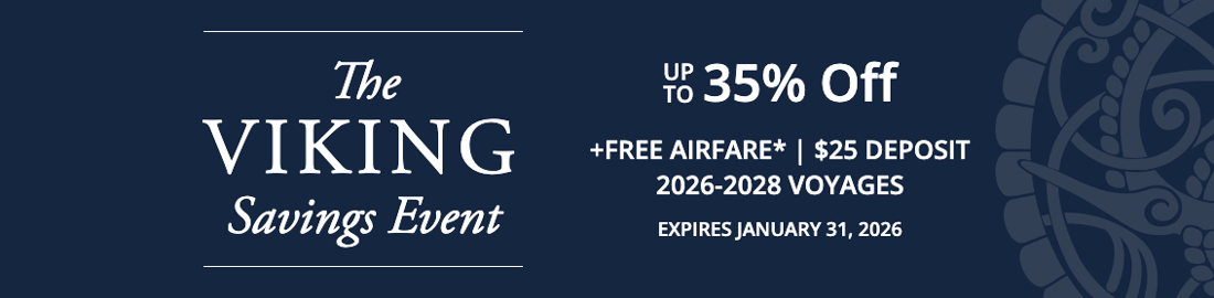 GENERAL RESTRICTIONS: Cruise fares listed are cruise only in U.S. dollars, per person, based on double occupancy. Single supplement savings are off applicable rates. Cruise fares listed are valid for U.S. residents only. All fares and offers are for new bookings only and are subject to availability, may not combinable with other offers except Viking Explorer Society Travel Credits, are capacity-controlled and may be withdrawn at any time without prior notice. Special fares are based upon published full brochure fares; cruise fares do not include pre-paid charges, optional facilities, and personal charges, as defined in the terms and conditions of the Passenger Ticket Contract which may be viewed elsewhere on this website. Full brochure fares may not have resulted in actual sales in all stateroom categories and may not have been in effect during the last 90 days. Promotional fares may remain in effect after the expiration date. Air promotion applies to roundtrip flights only from select Viking Cruises U.S. gateways and includes airport-to-ship or hotel transfers, air taxes and air fuel surcharges. Roundtrip airport transfers are included when air is purchased with a cruise or cruisetour package; if air is not purchased from Viking, transfers may be purchased separately. All transfers must be in conjunction with a Viking-purchased cruise, cruisetour, land extension or extra hotel nights. Viking reserves the right to correct errors or omissions and to change any and all fares at any time. For up-to-date prices, please call Viking or your Travel Agent. Additional terms and conditions may apply. Complete terms and conditions may be found in the Passenger Ticket Contract.