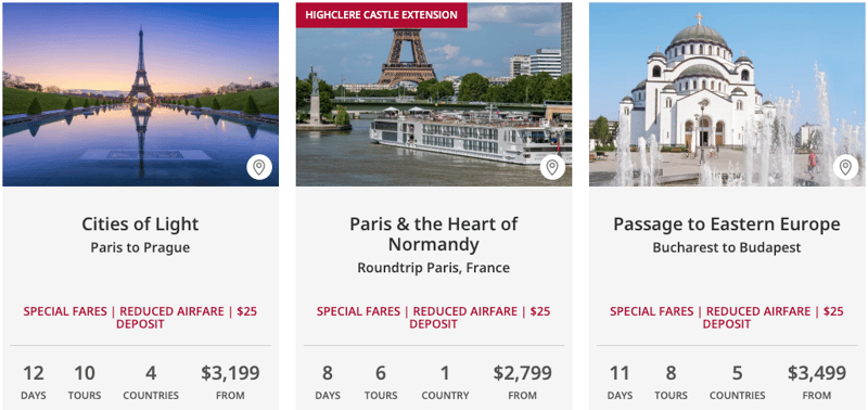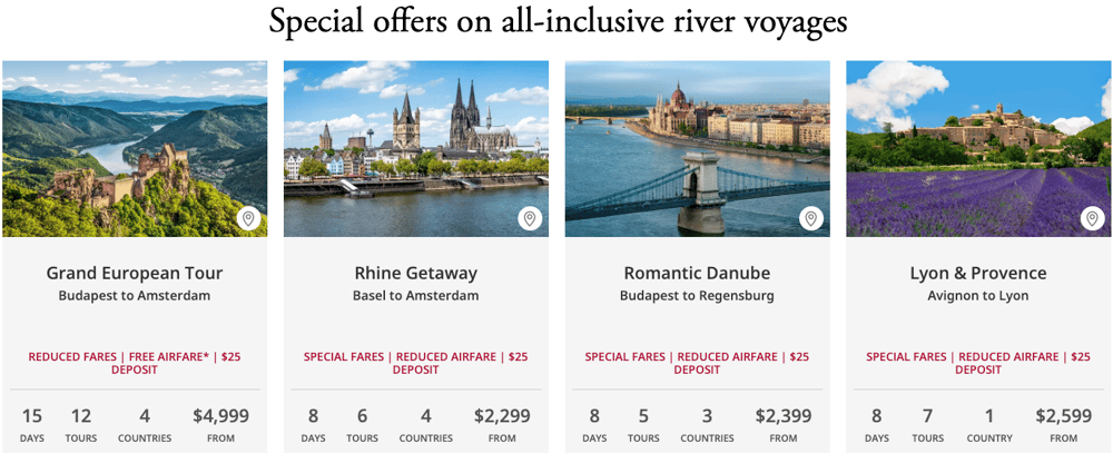 *2026-2028 RIVER CRUISE AND AIR FARES: Offer applies to bookings made from January 1-31, 2026. Terms & conditions for select promotions may vary. $25 deposit is applicable to all River itineraries. Special fares plus up to FREE International airfare valid on select departures of Grand European Tour, Lyon Provence & the Rhineland, European Sojourn, Capitals of Eastern Europe, London, Paris & D-Day, Pharaohs & Pyramids, Magnificent Mekong. Airfares may vary on other gateways & departures. Airfare does not have to be purchased to get cruise\cruisetour offer. All prices are in US dollars and for US residents only. Additional restrictions may apply.