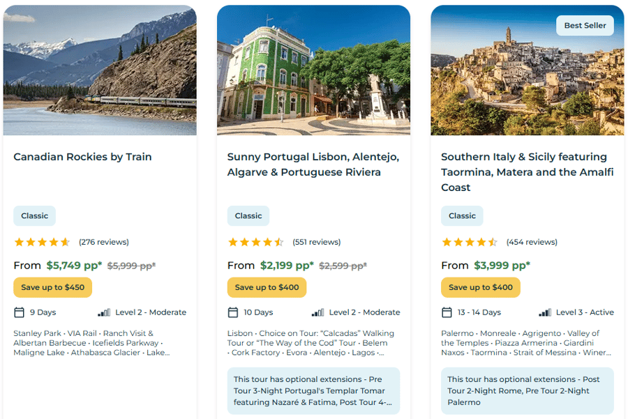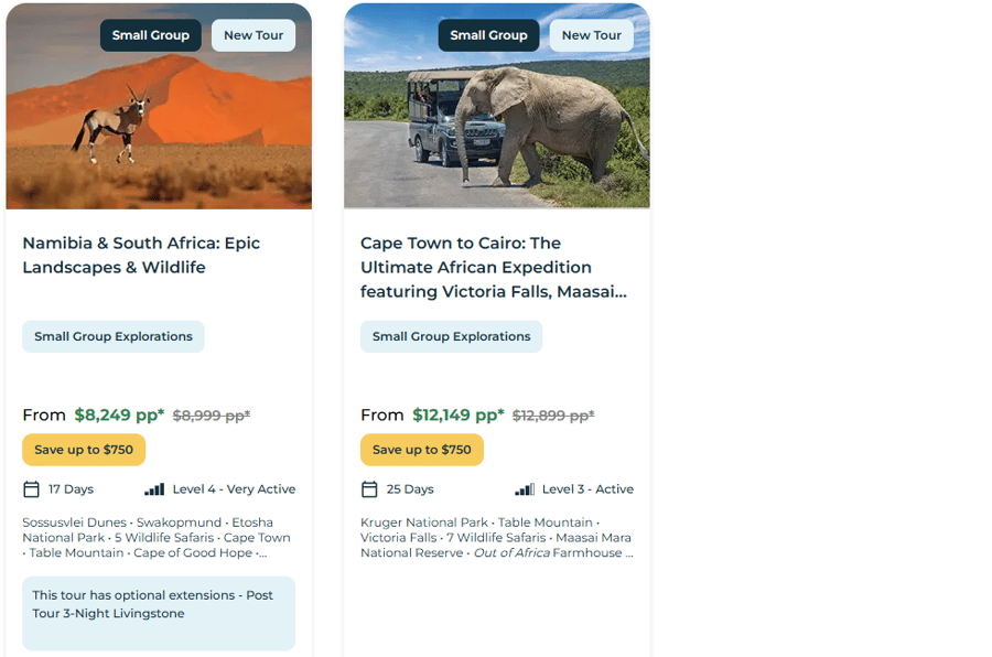 - $100 credit toward tour add-ons* (anything beyond land packages and waiver; including pre/post tour extensions, optional excursions, etc.)