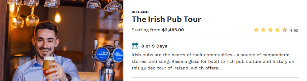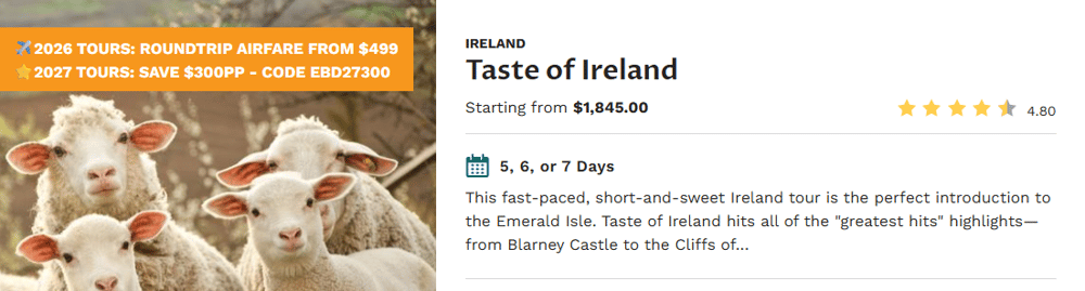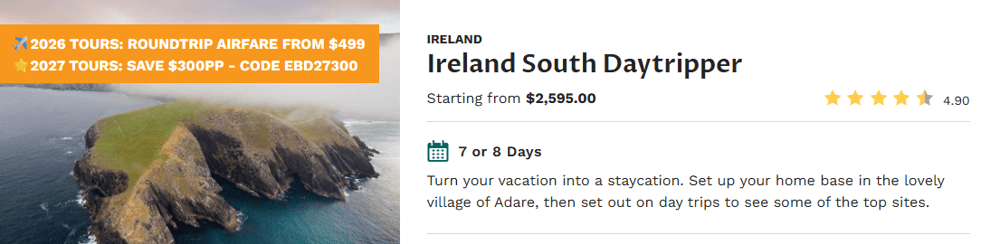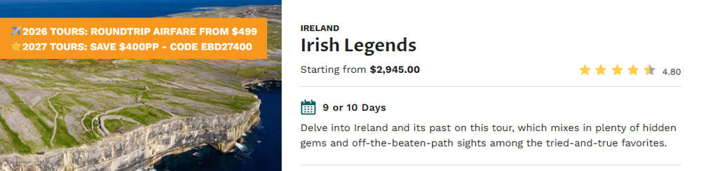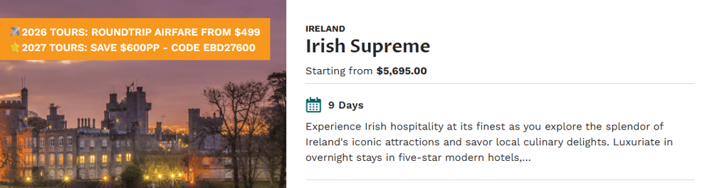 Best of Ireland South, Evergreen Ireland North, Evergreen Ireland South, Ireland South Daytripper, Ireland Walking & Hiking: Cork to Kerry, Ireland Walking & Hiking: The Northern Coast, Ireland's Wild Atlantic Way, Irish Adventure, Irish Classic, Irish Gold, Irish Legends, Irish Odyssey, Irish Spirit, Irish Supreme, Jewels of Ireland, Mystical Ireland, Southern Gems, Taste of Ireland, The Irish Pub Tour, or qualifying Private Driver vacations of $4,999 or more per person, when booked March 2–31, 2026, for travel July 1–December 31, 2026.