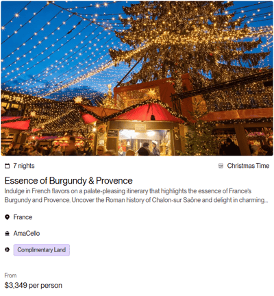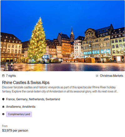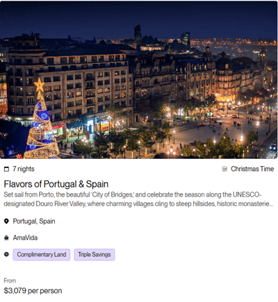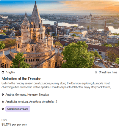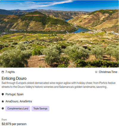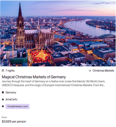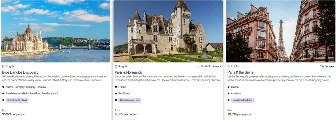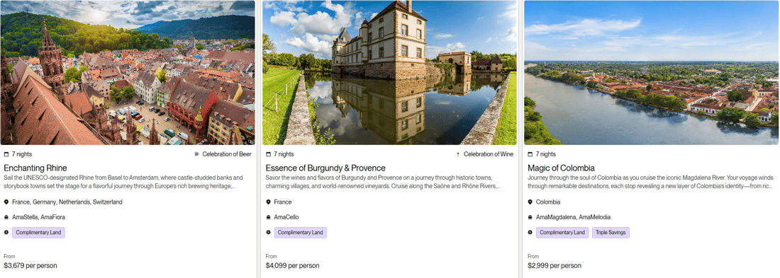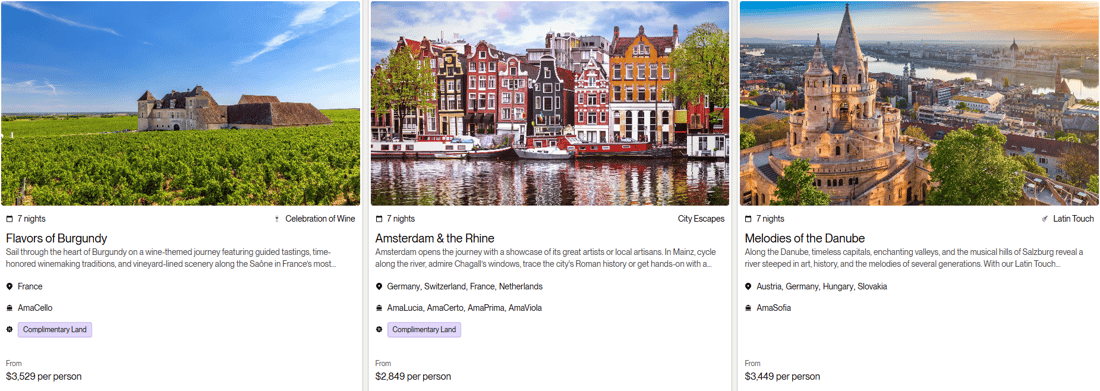 Terms & Conditions: All rates are per person in USD for cruise only, based on double occupancy in Category E stateroom, inclusive of port charges. Offer includes one complimentary eligible Land Package per person on new FIT and Group reservations made December 31 - June 30, 2026, for select 2026 and 2027 Europe and Colombia sailings. Offer valid on double occupancy; Tour Operators eligible; additional restrictions apply. Availability of sailings and land packages may vary due to local events. Not all advertised Land Packages are eligible; details provided at booking. Additional land packages available for purchase. Complimentary Land is valid only with a full-fare cruise; hotel-to/from-ship transfer included; airport transfers available at extra cost. Offer combinable with AirPlus Rates, Combination Cruise Savings, Past Guest Savings, and Future Cruise Benefit Program. Solo travelers must pay full single supplement to receive complimentary land. Offer not applicable to travel advisors, industry rates, or other restricted offers. Hotel listings are not guaranteed and may be substituted with similar properties; AmaWaterways will confirm hotel details 3–4 weeks prior to departure when Digital Travel Documents are issued. Stateroom upgrades, optional land packages, visas, airfares, and gratuities are additional. Offer is capacity controlled, combinability limited, and subject to change or withdrawal without notice. AmaWaterways reserves the right to correct errors or omissions. Registration as a seller of travel does not constitute approval by the State of California. For full terms and conditions, visit www.amawaterways.com/terms-conditions. CST#2065452-20.
