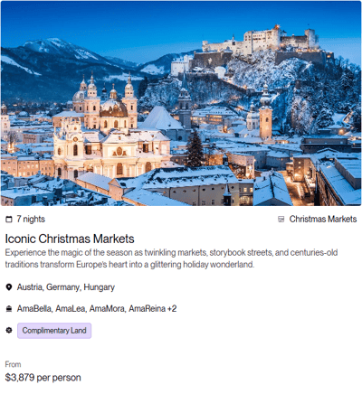 Now extended through June 30, 2026, receive a pre- or post-cruise land package when you reserve select 2026 and 2027 departures through Europe and Colombia. Enjoy up to 4 extra nights in iconic destinations such as European Christmas Markets, Lake Como, Prague, or Budapest, complete with guided tours, transfers, and luxury hotel accommodations.