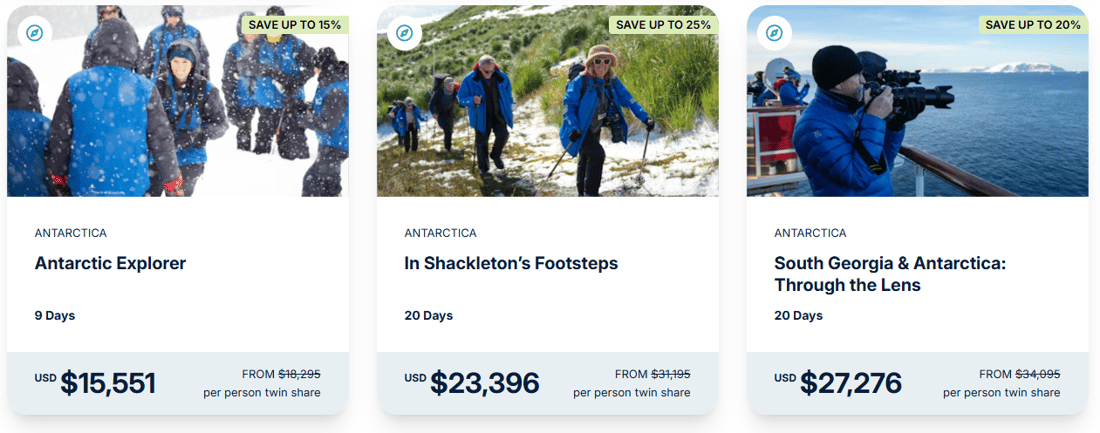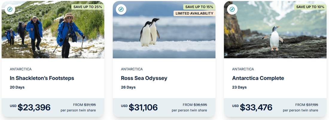 Antarctica Savings: Advertised savings of up to US$8,899 is per person, based on double occupancy in United States dollars and is based on In Shackleton’s Footsteps (ASH003D) in a Balcony Stateroom Category B and is correct as of 31 March 2026.
