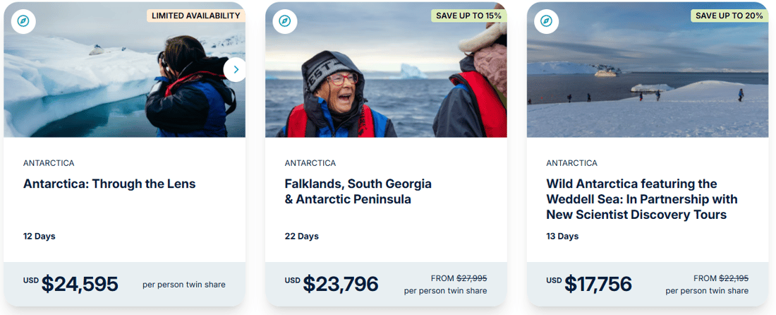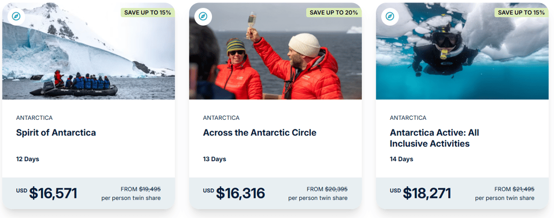 *The Extraordinary Awaits Savings | Save up to US$6,499 off 2026/27/28 expeditions: Offer valid on new bookings of select departures only, which must be booked and deposited 1 April to 30 June 2026 or until sold out. Promotion is subject to availability at the time of booking and capacity controlled. The promotion is combinable with the back-to-back voyage discount or the loyalty program offer only, and not available with any other offer. The promotion can be withdrawn at any time and is not redeemable for cash. Advertised savings are per person, based on double occupancy in United States dollars, are based on bookings made in a Balcony Stateroom Category B and are correct as of 31 March 2026. Specific regional savings amounts below: