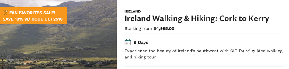 CIE Tours guests have spoken — these highly rated Guided Tours of Ireland feature their favorite attractions and experiences. Now you can save up to 15% on these 12 celebrated journeys: 10 timeless classics plus 2 new small-group adventures (never more than 16 guests): Ireland Walking & Hiking Tours.
