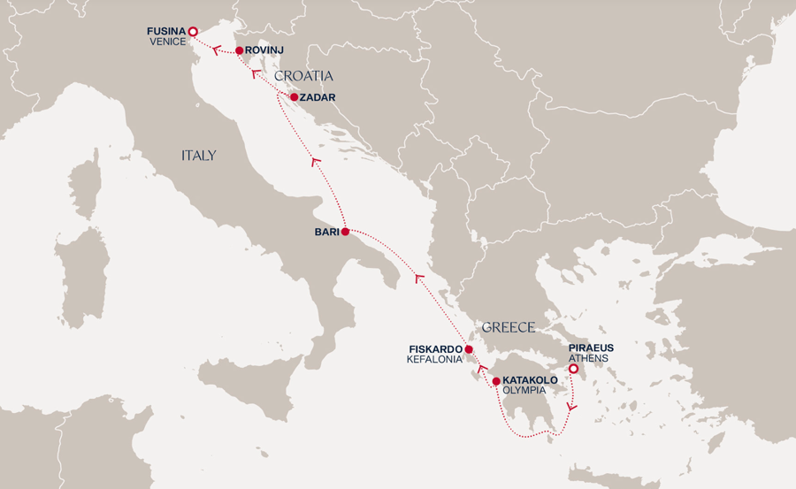 Slip back into classical antiquity as we move from the Acropolis to Katakolo, gateway to Ancient Olympia, and step among the ruins of temples, colonnades and stadia, reliving the first ever games held in 776 BC. From the Peloponnese to Corelli’s Kefalonia, cast into the Ionian, where we pick up a thread woven by the Venetians leading us to lagoons of La Serenissima via the unfolding, never-ending charms of Puglia, Dalmatia and lesser-travelled Istria.