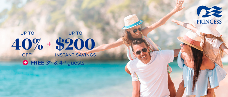 For a limited time, get up to 40% off and up to $200 instant savings on a Princess cruise. And if you’re bringing the whole crew, we’ve got you covered with FREE 3rd & 4th guests on select sailings. Don’t leave anyone behind — book now before this offer ends!