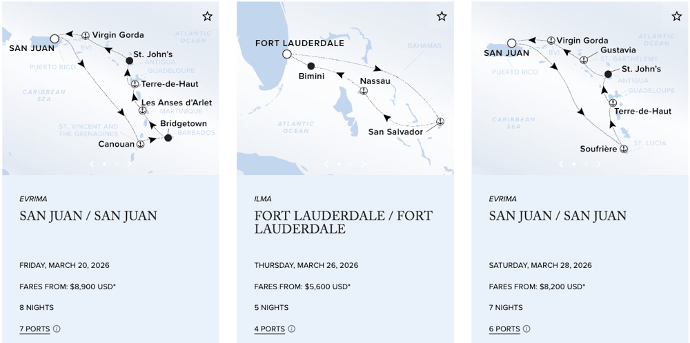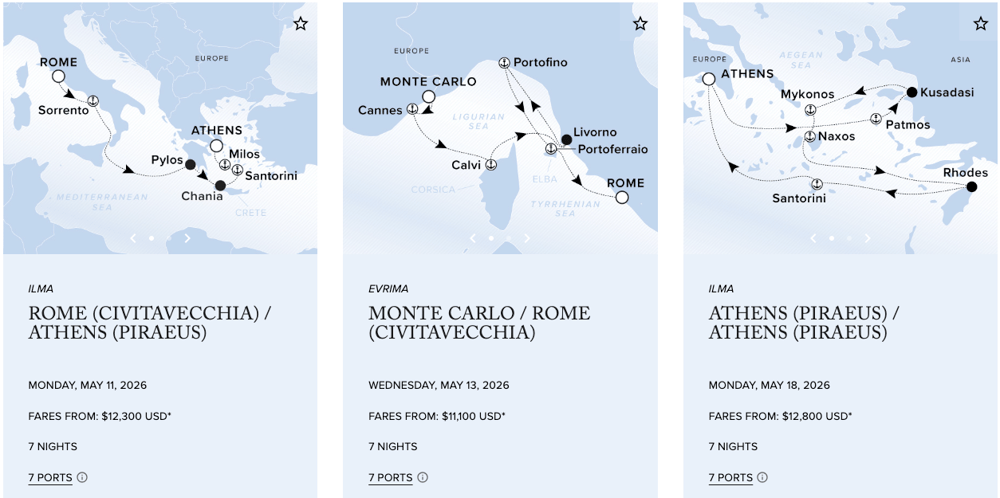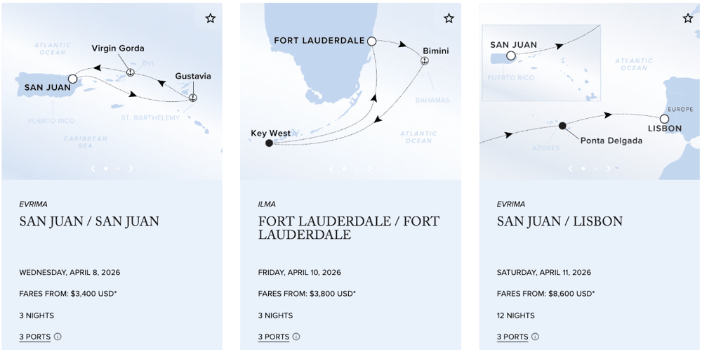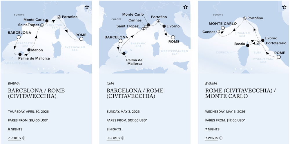 Designed to combine the luxury lifestyle of The Ritz-Carlton® and the casual freedom of a yachting vacation, The Ritz-Carlton Yacht Collection offers bespoke voyages in the Mediterranean, the Caribbean and Central America. Calling on unique and distinguished destinations alike, most voyages range from seven to ten nights, offering many overnight calls and uniquely curated experiences ashore. The first yacht, Evrima, set sail on its maiden voyage in October 2022. Measuring 190-meters in length, Evrima features 149 suites, each with its own private terrace, and accommodates up to 298 guests in a relaxed, casually elegant atmosphere. The Ritz-Carlton Yacht Collection plans to expand its fleet with two new build superyachts, Ilma and Luminara, slated to set sail in 2024 and 2025, respectively. The specially designed superyachts measure 241-meters in length, feature 228 spacious suites and one of the highest space ratios at sea. As with The Ritz-Carlton on land, our yachts feature personalized service, elevated dining and luxury amenities. The yachts are also available for private charter.